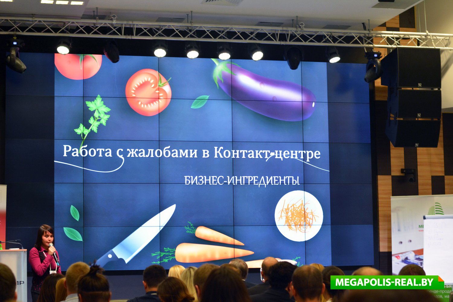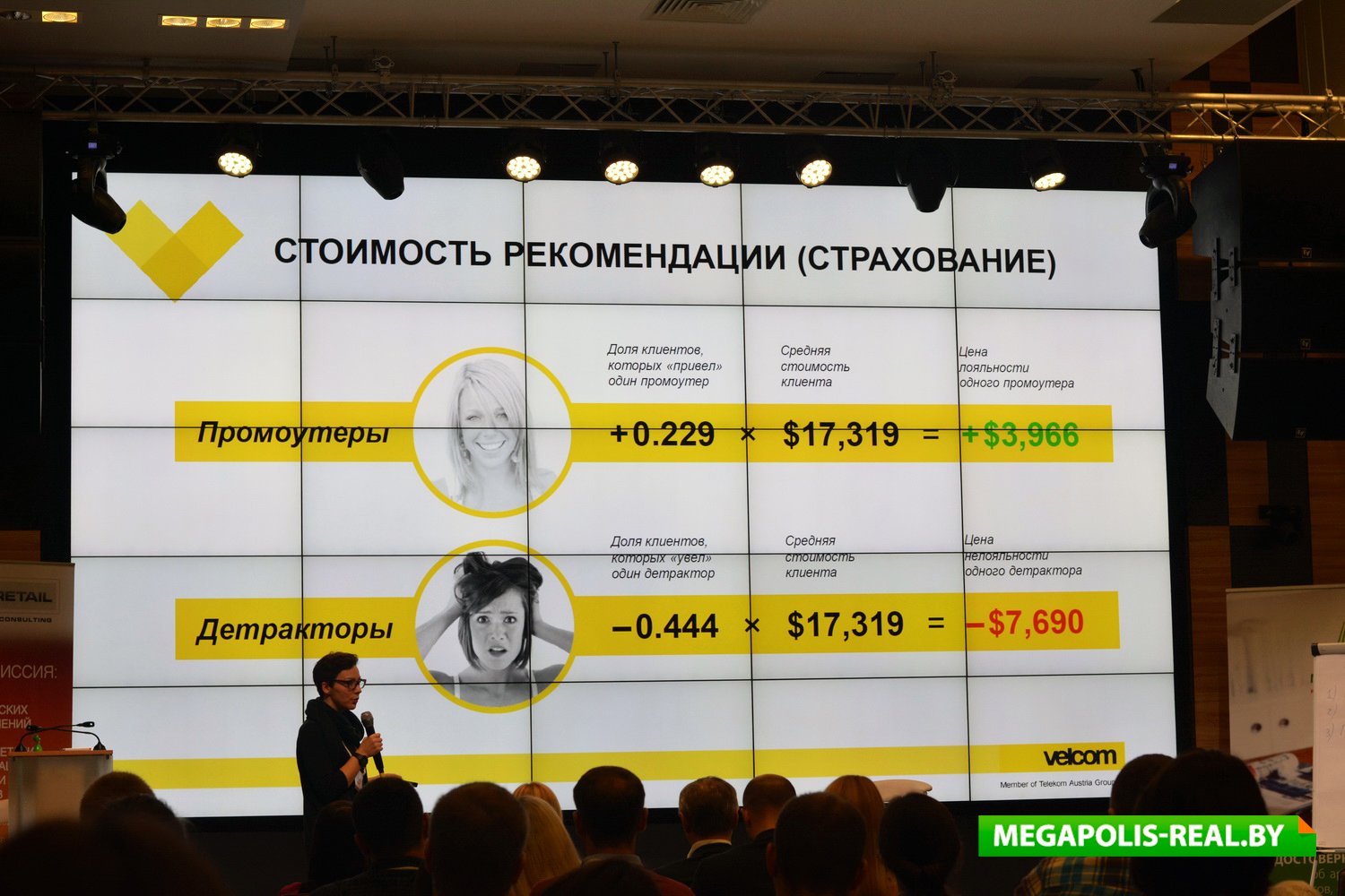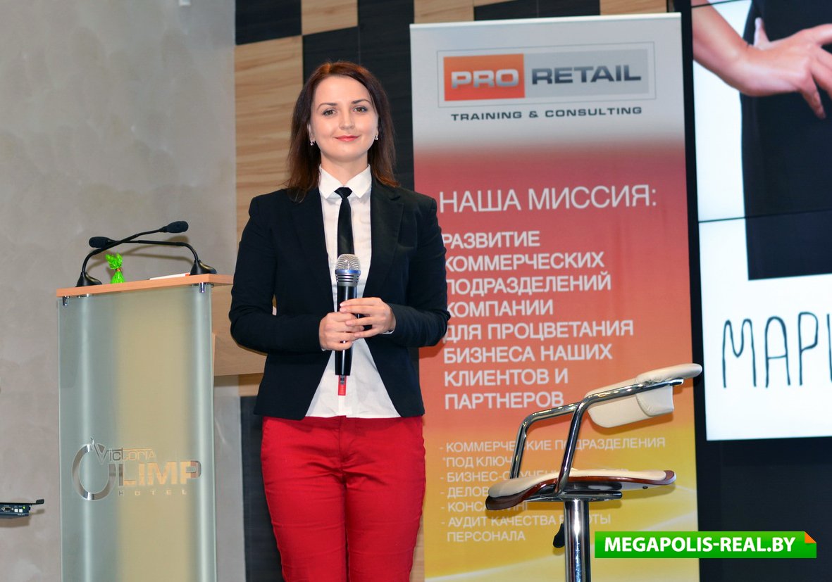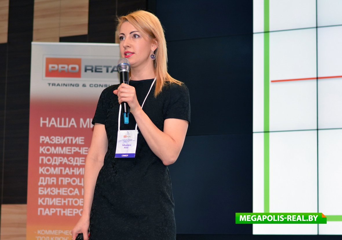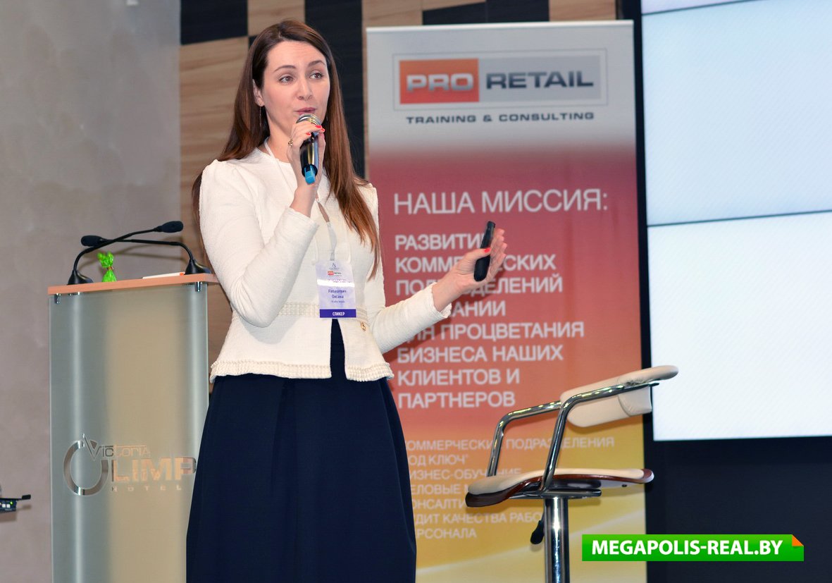Первым спикером, приглашённым на сцену, была партнёр в «Pro Retail» Оксана Рапацевич. Она рассказала публике о неудачных примерах размещённых в торговых залах от имени администрации объявлений, которые могут испортить все усилия маркетологов и сделать бесполезными рекламные бюджеты. Например, «Просьба ложить конфеты в отдельные пакеты. Спасибо!», «Акция Кока-колы завершена. Стаканов больше нет», «Уважаемые покупатели, просьба не сажать детей в тележки. Администрация». Чтобы избежать подобных ошибок, спикер предложила при составлении объявлений всегда ориентироваться на три важных момента: клиентоориентированный подход, внимательную работу с жалобами и претензиями, использование эмоций и фишек.