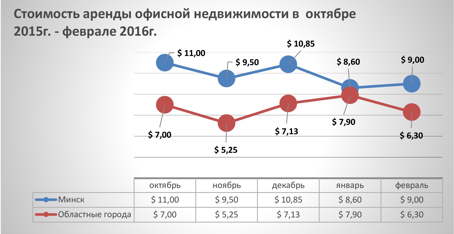 - Средняя стоимость аренды офисов в Минске в феврале 2015г. составила 9 $ за кв.м. По сравнению с январем 2016 (8,6 $) этот показатель достаточно стабилен.
