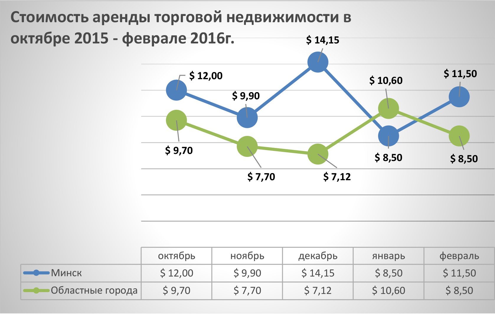 - средняя стоимость торговой недвижимости в Минске по сравнению с предыдущим месяцем увеличилась на 35% и составила 11,5 $ за кв.м (стоимость в январе – 8,5 $).