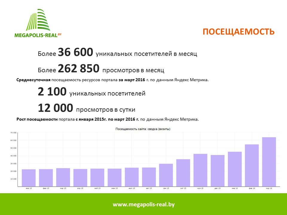 Нам приятно отметить, что портал развивается, количество объявлений с каждым месяцем увеличивается. Растет и посещаемость сайта. Со своей стороны, наши специалисты следят за актуальностью и достоверностью размещаемой информации, ведется постоянная работа по техническому усовершенствованию портала, мы стремимся сделать наш проект удобным и полезным для пользователей.